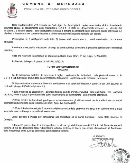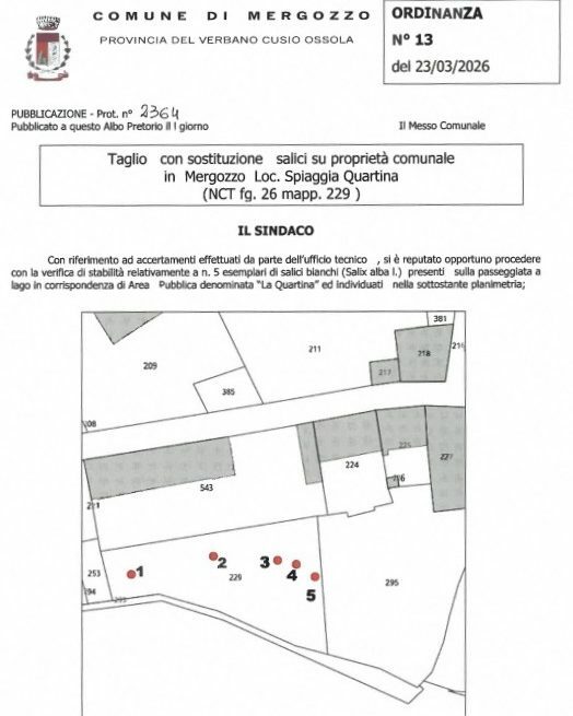 Il Comune di Mergozzo ha emesso l’ordinanza con cui dispone l’abbattimento di quattro esemplari di salice bianco situati in località Spiaggia Quartina, lungo la passeggiata a lago nell’area pubblica denominata “La Quartina”.