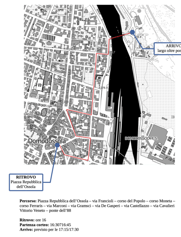 Per consentire lo svolgimento in sicurezza dell’iniziativa, è stata emessa un’ordinanza da parte del Comandante del Corpo di Polizia Locale di Domodossola, che dispone il divieto di transito lungo tutto il percorso del corteo.