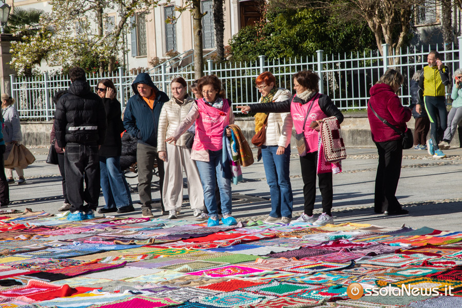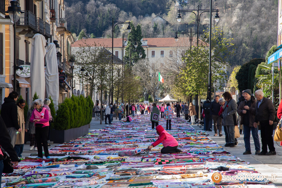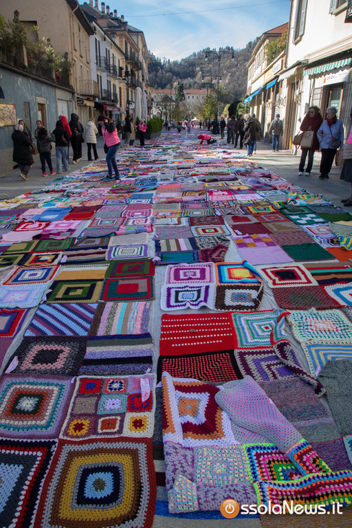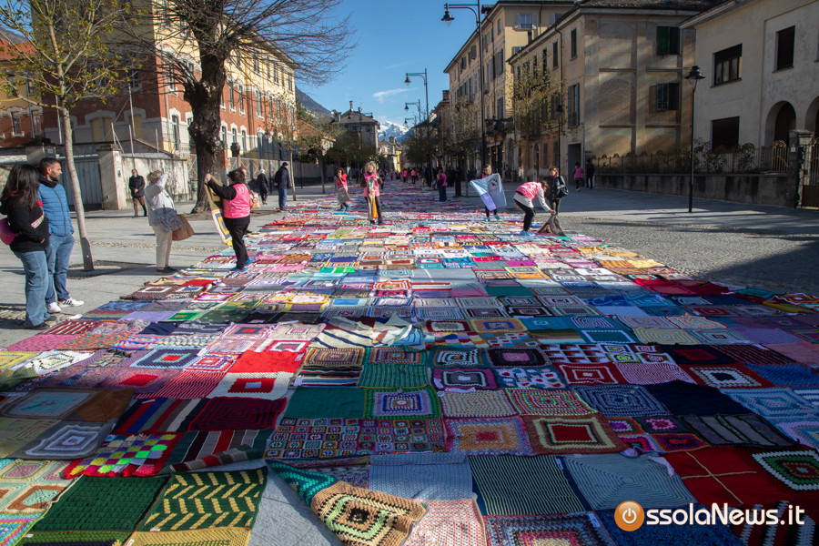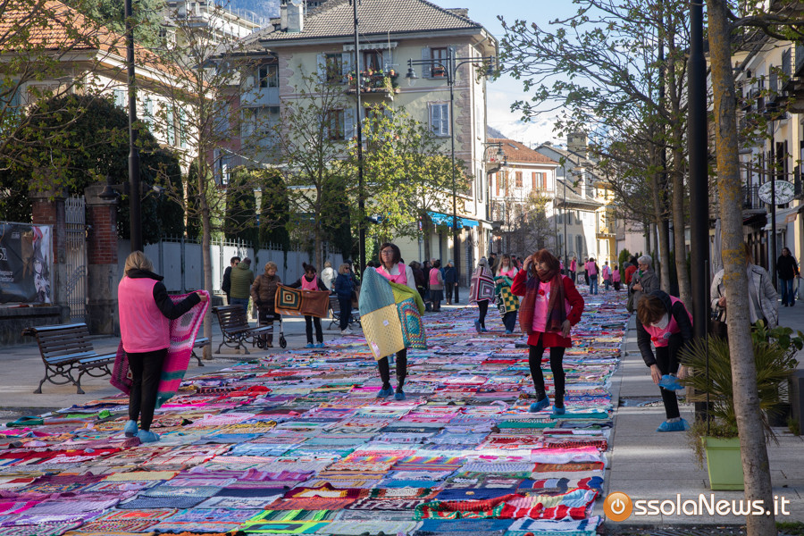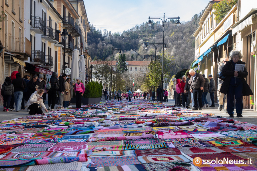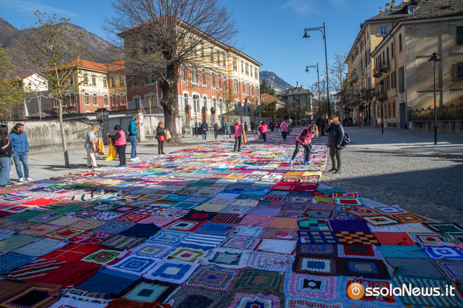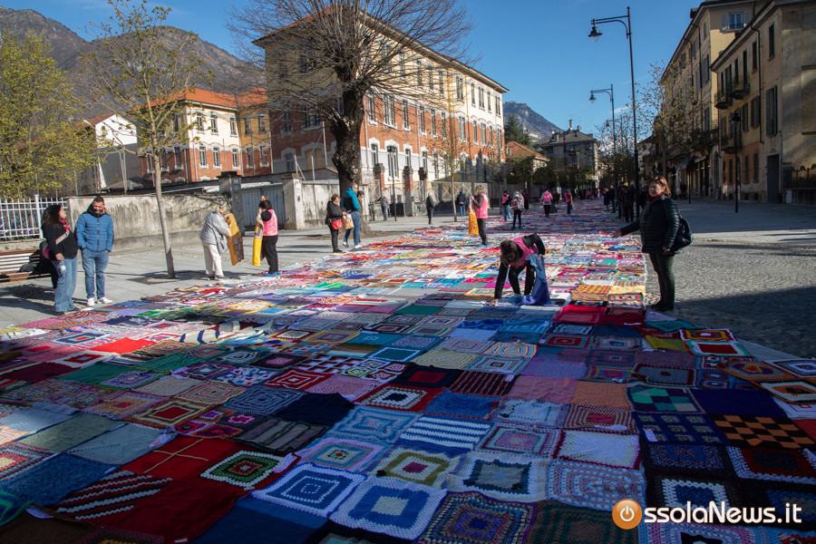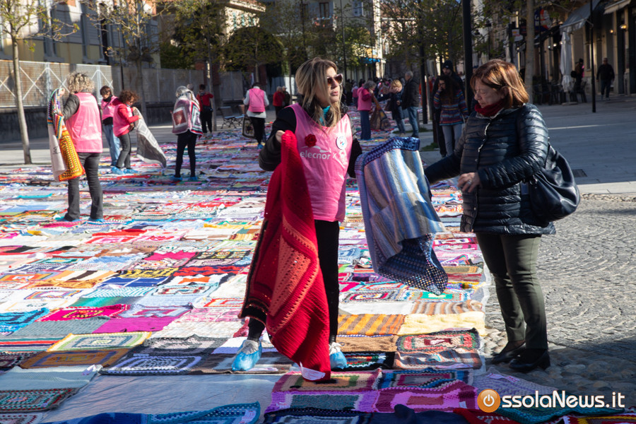 Dalle prime ore del mattino, via Rosmini si è trasformata in un grande tappeto colorato: oltre 1.500 coperte realizzate in questi mesi grazie al lavoro di circa cento donne, non solo del Vco, che hanno lavorato a maglia o all’uncinetto unendo i quadrati con il filo rosso simbolo dell’iniziativa. Ogni coperta è disponibile con un’offerta minima di 20 euro.