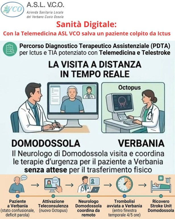 Un passo avanti significativo per la rete dei servizi neurologici dell’Asl Vco grazie all’implementazione della Telemedicina e del Telestroke, strumenti che potenziano il Percorso Diagnostico Terapeutico Assistenziale (Pdta) per ictus e TIA. Il sistema, sviluppato in linea con i progetti regionali sulle patologie tempo-dipendenti in ambito neurologico, integra innovazione tecnologica e formazione del personale medico e infermieristico, garantendo interventi urgenti anche quando lo specialista non è presente fisicamente.