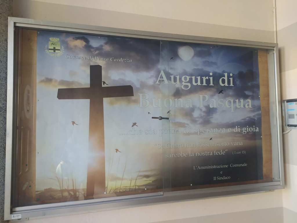 Da sindaco cattolico praticante e sempre in prima linea nella difesa dei valori cristiani, il primo cittadino di Beura Davide Carigi, anche a nome dell'amministrazione, ha voluto augurare ai cittadini Buona Pasqua piena di speranza e di gioia con un grande manifesto di circa 2 metri di lunghezza e 1 metro di altezza.