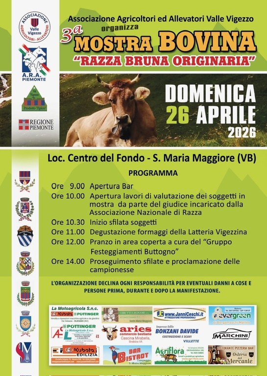 La Valle Vigezzo si prepara ad accogliere uno degli eventi più rappresentativi del suo tessuto agricolo: domenica 26 aprile torna, per la terza edizione, la Mostra Bovina dedicata alla “Razza Bruna Originaria”. L’appuntamento è al Centro del Fondo di Santa Maria Maggiore, dove allevatori, operatori del settore e appassionati si ritroveranno per una giornata all’insegna della tradizione e della valorizzazione zootecnica.