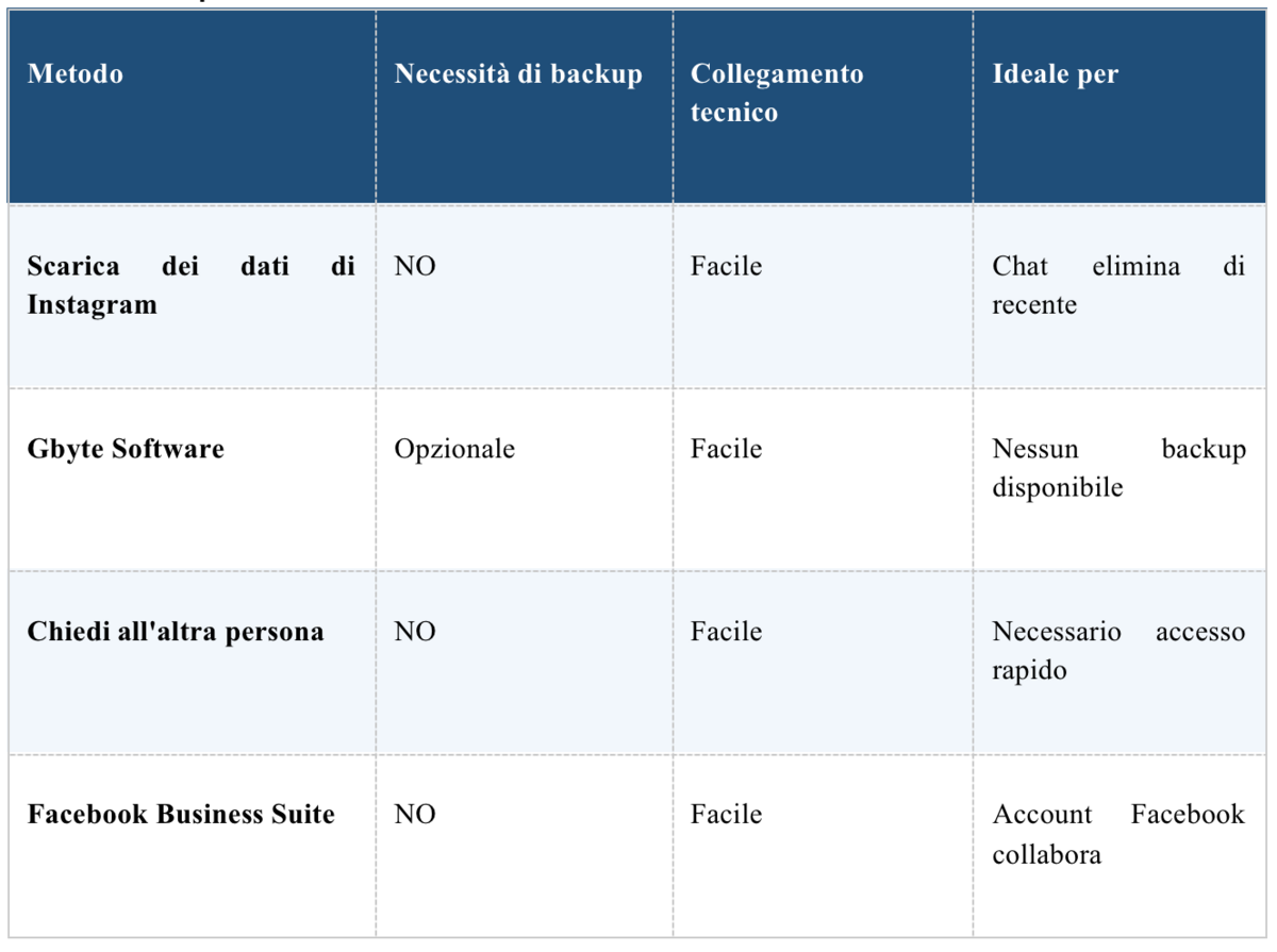 Se il metodo di download dei dati non restituisce i messaggi di cui hai bisogno, o se i messaggi sono stati eliminati prima di Instagram, puoi trovare maggiori informazioni su come funziona nella guida dettagliata di GBite su come recuperare i messaggi eliminati da Instagram.